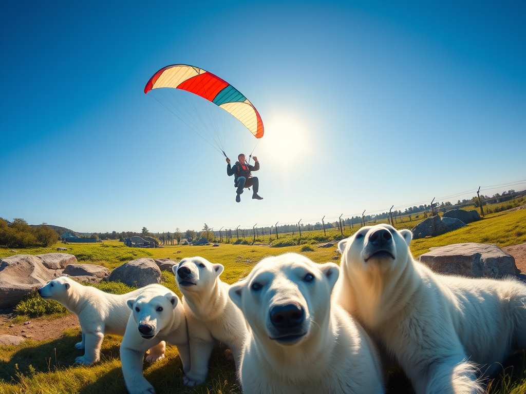 I can well imagine what the gliders were thinking. ” Jeez, we’ve got too close there’s no thermals here. We’re losing height, it was your idea to oggle at the polar bears for free!” Still any disagreements about their situation were postponed till after they had landed safely out of reach of a few tonnes of white furry claws and teeth. Their skill at maneuvering their fantastic flying machines were tested to the limit and thank heavens they didn’t land on any of the enclosures fencing .As this would have meant not only costly repairs but also a possible Polar Bear jaunt, hence the option of using a method that would probably give the bears a sleepy headache but otherwise keep them safe. Thankfully, there were rangers about with the necessary equipment so that they could anaesthetize the bears should it prove necessary. Although it would stop them from travelling , it wouldn’t have stopped them from having a paraglider lunch.