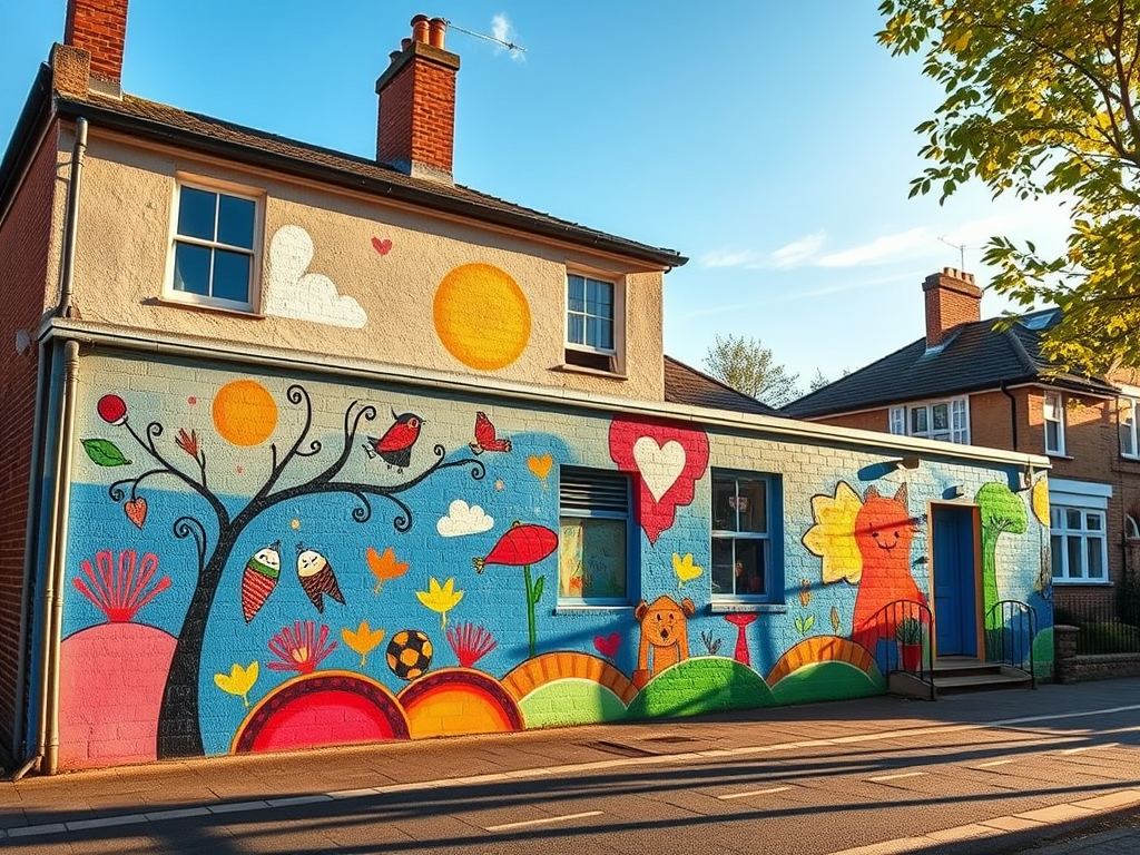 The mural itself is very bright, colourful and artistic having been designed with the help of the local school children as well as financed not by local taxes but by local developers who obviously do not have any problem getting planning permission.