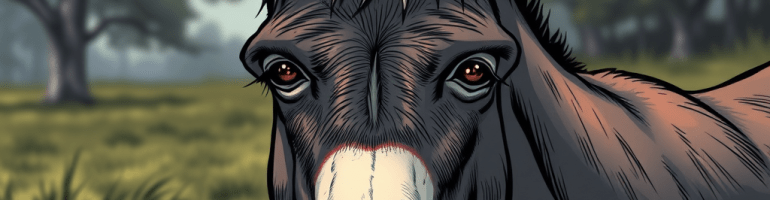 This donkey is actually a very happy donkey, he has lots of grass to eat and an nice barn to sleep in. He just looks sad.