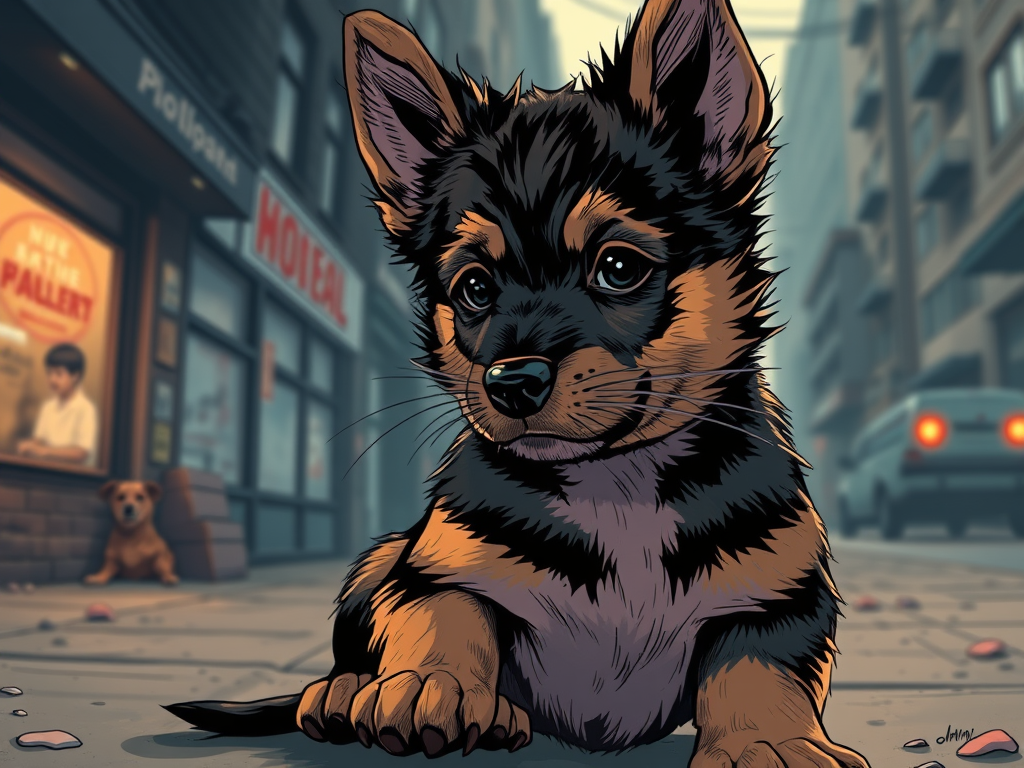 The little pup; though he went through some very hard times and lots of adventures survived on the streets. In truth , he had lost faith in people and felt it was only other animals he could trust. He avoided getting involved with people and would only steal food when he knew he could get away with it. He was always hungry , he was very careful not to trust people, even when they offered him free food. He had heard what the man who used to care for him had said , so he was very wary.